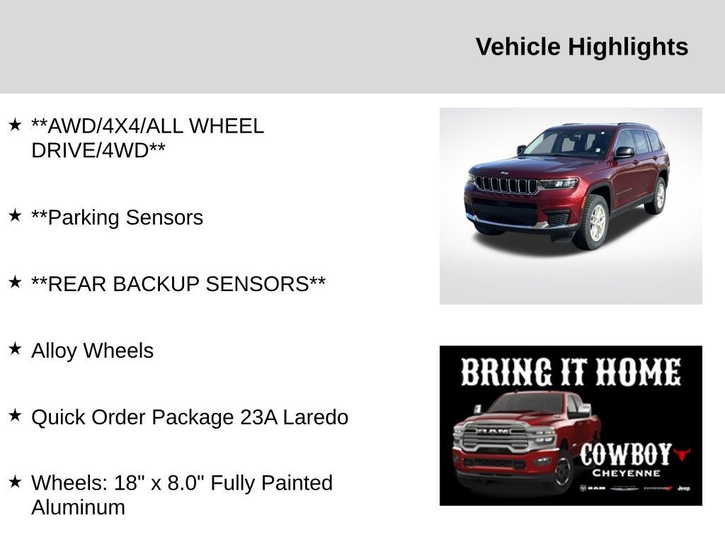 Discover the exceptional 2023 Jeep Grand Cherokee L Laredo, a versatile and capable SUV that combines rugged performance with refined style. This stunning Red beauty boasts a powerful 3.6L V6 24V VVT engine paired with an 8-Speed Automatic transmission and 4WD, delivering an impressive 18 city and 25 highway MPG.