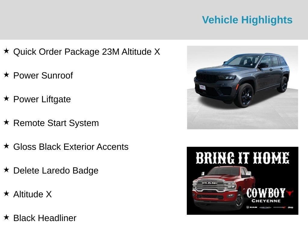 New Price! Baltic Gray Metallic Clearcoat 2025 Jeep Grand Cherokee Altitude X 4WD 8-Speed Automatic 3.6L V6 24V VVT 115V Auxiliary Power Outlet, Altitude X, Black Headliner, Capri Leatherette/Suede Seats, Delete Laredo Badge, Gloss Black Exterior Accents, Heated Front Seats, Heated Steering Wheel, Power Liftgate, Power Sunroof, Quick Order Package 23M Altitude X, Rain Sensitive Windshield Wipers, Remote Start System, Selectable Tire Fill Alert, Wheels: 18" x 8" Fully Painted Aluminum 1, Wireless Charging Pad.