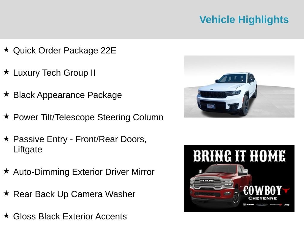 Bright White Clearcoat 2025 Jeep Grand Cherokee L Limited 4WD 8-Speed Automatic 3.6L V6 24V VVT 2nd Row Manual Window Shades, Auto-Dimming Exterior Driver Mirror, Black Appearance Package, Capri Leatherette w/Axis II Seats, Gloss Black Exterior Accents, Integrated Off-Road Camera, Intersection Collision Assist System, Luxury Tech Group II, Memory Steering Column, ParkSense Front/Rear Park Assist w/Stop, Passive Entry - Front/Rear Doors, Liftgate, Power Tilt/Telescope Steering Column, Quick Order Package 22E, Rain Sensitive Windshield Wipers, Rear Back Up Camera Washer, Rearview Autodim Digital Display Mirror, Surround View Camera System, Ventilated Front Seats, Wheels: 20" x 8.5" Gloss Black Painted Aluminum, Wireless Charging Pad. Price includes: $1000 - 2025 National Grand Cherokee Loyalty Retail Bonus Cash . Exp. 11/03/2025 $2000 - 2025 National Retail Bonus Cash . Exp. 11/03/2025 $2000 - 2025 National SFS Lease Loyalty Bonus Cash. Exp. 11/03/2025