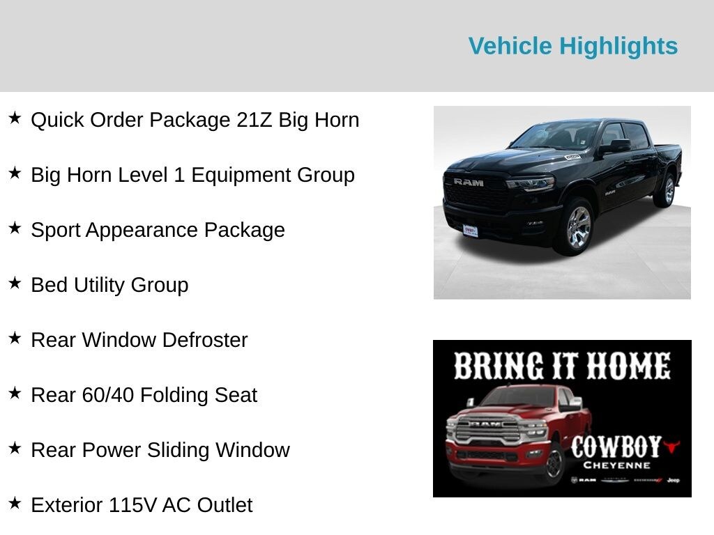 Diamond Black Crystal Pearlcoat 2025 Ram 1500 Big Horn/Lone Star 4WD 8-Speed Automatic 3.0L I6 115V Auxiliary Power Outlet, 2nd Row In Floor Storage Bins, 3 Rear Seat Head Restraints, 4 Way Front Headrests, 400W Inverter, Auto Power-Folding Mirrors, Auto-Dimming Exterior Driver Mirror, Auto-Dimming Rear-View Mirror, Bed Utility Group, Big Horn Level 1 Equipment Group, Black Exterior Mirrors, Black Interior Accents, Black Premium Power Mirrors, Body Color Door Handles, Body Color Front Bumper, Body Color Rear Bumper w/Step Pads, Body Color Tailgate Handle, Bucket Seats, Convex Wide-Angle Exterior Mirror Insert, Deluxe Cloth Bucket Seats, Exterior 115V AC Outlet, Exterior Mirrors Courtesy Lamps, Exterior Mirrors w/Heating Element, Exterior Mirrors w/Supplemental Signals, Front Seat Back Map Pockets, Full Length Floor Console, Glove Box Lamp, Grille Surround 1 Body Color Texture 1 Black, Heated Front Seats, Heated Steering Wheel, Leather Wrapped Steering Wheel, Manual Adjust 4-Way Front Passenger Seat, MOPAR 4 Adjustable Cargo Tie-Down Hooks, MOPAR Spray In Bedliner, Pick-Up Box Lighting, Power 2-Way Driver Lumbar Adjust, Power Adjust 8-Way Driver Seat, Power Adjustable Pedals, Quick Order Package 21Z Big Horn, RAM Grille Badge - Chrome, Rear 60/40 Folding Seat, Rear Center Armrest, Rear Power Sliding Window, Rear Window Defroster, Sport Appearance Package, Steering Wheel Mounted Audio Controls, Sun Visors w/Illuminated Vanity Mirrors, Universal Garage Door Opener. Price includes: $1000 - 2025 West BC SFS Bonus Cash . Exp. 11/03/2025 $1000 - 2025 West BC SFS Retail Bonus Cash . Exp. 11/03/2025 10% Msrp - 2025 National 10% Below MSRP . Exp. 11/03/2025