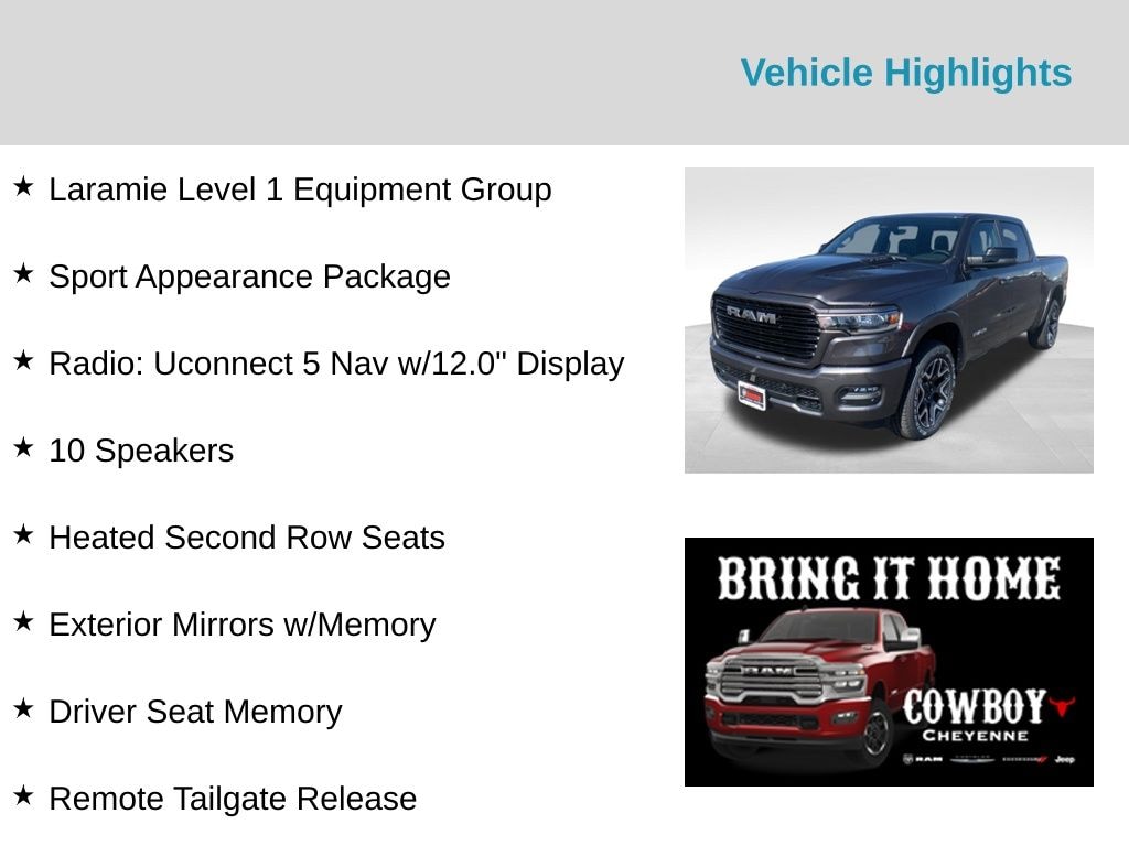 New Price! Granite Crystal Metallic Clearcoat 2025 Ram 1500 Laramie 4WD 8-Speed Automatic 3.0L I6 10 Speakers, 3 Rear Seat Head Restraints, 4 Way Front Headrests, Accent Color Premium Power Mirrors, Apple CarPlay/Android Auto, Auto Power-Folding Mirrors, Auto-Dimming Exterior Driver Mirror, Black Painted Exterior Mirrors Caps, Body Color Front Bumper, Body Color Rear Bumper w/Step Pads, Bucket Seats, Center Console Parts Module, Convex Wide-Angle Exterior Mirror Insert, Driver Seat Memory, Exterior Mirrors Courtesy Lamps, Exterior Mirrors w/Heating Element, Exterior Mirrors w/Memory, Exterior Mirrors w/Supplemental Signals, Full Length Upgraded Floor Console, Grille Surround 3 Body Color Tex 2 Black, Heated Front Seats, Heated Second Row Seats, Heated Steering Wheel, Laramie Level 1 Equipment Group, Leather Trimmed Bucket Seats, MOPAR Front & Rear Rubber Floor Mats, Power 2-Way Driver Lumbar Adjust, Power 2-Way Passenger Lumbar Adjust, Power Adjust 8-Way Driver Seat, Power Adjust 8-Way Front Passenger Seat, Radio: Uconnect 5 Nav w/12.0" Display, Rain Sensitive Windshield Wipers, RAM Grille Badge - Chrome, Rear 60/40 Folding Split Recline Seat, Remote Tailgate Release, Sport Appearance Package, Sport Performance Hood, Ventilated Front Seats, Wheels: 20" x 9" Premium Paint/Polish.