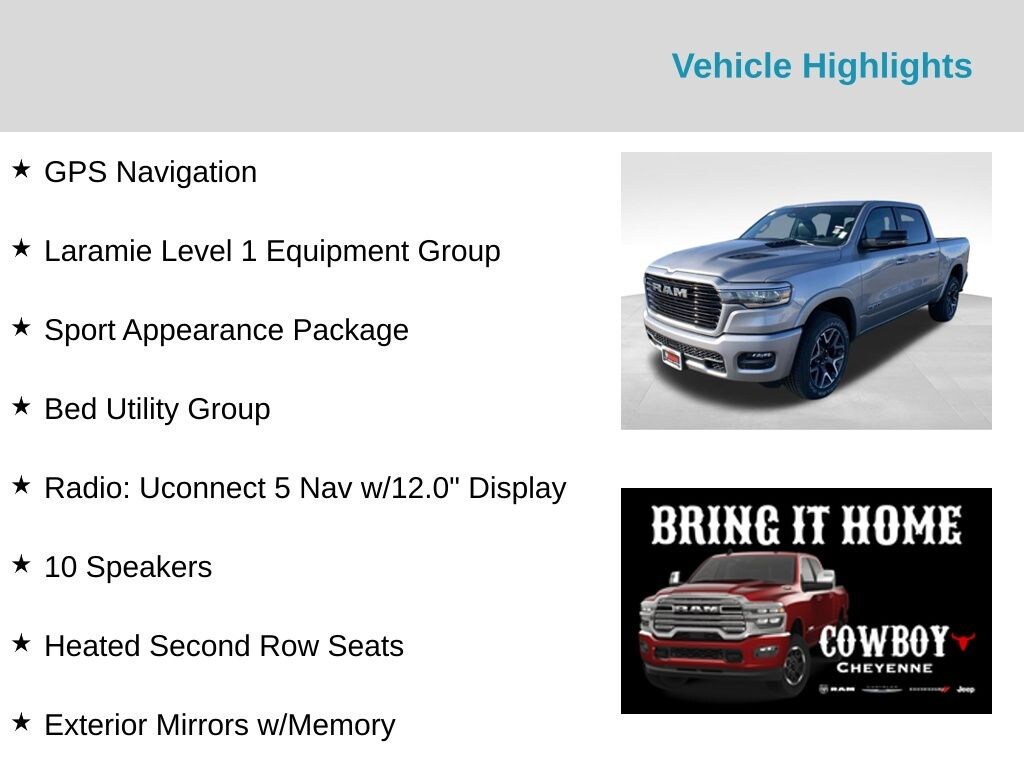 New Price! Billet Silver Metallic Clearcoat 2025 Ram 1500 Laramie 4WD 8-Speed Automatic 3.0L I6 #1 Seat Foam Cushion, 10 Speakers, 3 Rear Seat Head Restraints, 4 Way Front Headrests, Accent Color Premium Power Mirrors, Auto Power-Folding Mirrors, Auto-Dimming Exterior Driver Mirror, Bed Utility Group, Black Interior Accents, Black Painted Exterior Mirrors Caps, Body Color Front Bumper, Body Color Rear Bumper w/Step Pads, Bucket Seats, Center Console Parts Module, Convex Wide-Angle Exterior Mirror Insert, Driver Seat Memory, Exterior Mirrors Courtesy Lamps, Exterior Mirrors w/Heating Element, Exterior Mirrors w/Memory, Exterior Mirrors w/Supplemental Signals, Front Seat Back Map Pockets, Full Length Upgraded Floor Console, GPS Navigation, Grille Surround 3 Body Color Tex 2 Black, Heated Front Seats, Heated Second Row Seats, Heated Steering Wheel, Laramie Level 1 Equipment Group, Leather Trimmed Bucket Seats, MOPAR 4 Adjustable Cargo Tie-Down Hooks, MOPAR Spray In Bedliner, Power 2-Way Driver Lumbar Adjust, Power 2-Way Passenger Lumbar Adjust, Power Adjust 8-Way Driver Seat, Power Adjust 8-Way Front Passenger Seat, Radio: Uconnect 5 Nav w/12.0" Display, Rain Sensitive Windshield Wipers, RAM Grille Badge - Chrome, Rear 60/40 Folding Split Recline Seat, Remote Tailgate Release, Sport Appearance Package, Sport Performance Hood, Ventilated Front Seats, Wheels: 20" x 9" Premium Paint/Polish.