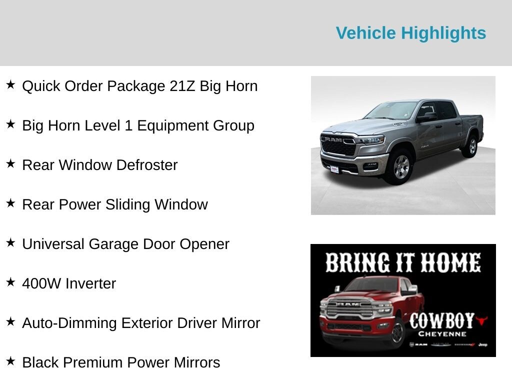 New Price! Billet Silver Metallic Clearcoat 2025 Ram 1500 Big Horn/Lone Star 4WD 8-Speed Automatic 3.0L I6 115V Auxiliary Power Outlet, 2nd Row In Floor Storage Bins, 400W Inverter, Auto Power-Folding Mirrors, Auto-Dimming Exterior Driver Mirror, Auto-Dimming Rear-View Mirror, Big Horn Level 1 Equipment Group, Black Exterior Mirrors, Black Premium Power Mirrors, Convex Wide-Angle Exterior Mirror Insert, Exterior Mirrors Courtesy Lamps, Exterior Mirrors w/Heating Element, Exterior Mirrors w/Supplemental Signals, Glove Box Lamp, Heated Front Seats, Heated Steering Wheel, Leather Wrapped Steering Wheel, Power 2-Way Driver Lumbar Adjust, Power Adjust 8-Way Driver Seat, Power Adjustable Pedals, Quick Order Package 21Z Big Horn, Rear Power Sliding Window, Rear Window Defroster, Steering Wheel Mounted Audio Controls, Sun Visors w/Illuminated Vanity Mirrors, Universal Garage Door Opener. Price includes: $1000 - 2025 West BC SFS Bonus Cash . Exp. 11/03/2025 $1000 - 2025 West BC SFS Retail Bonus Cash . Exp. 11/03/2025 $2000 - 2025 National SFS Lease Loyalty Bonus Cash. Exp. 11/03/2025 10% Msrp - 2025 National 10% Below MSRP . Exp. 11/03/2025