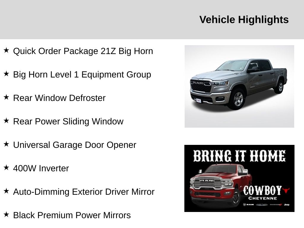 Billet Silver Metallic Clearcoat 2025 Ram 1500 Big Horn/Lone Star 4WD 8-Speed Automatic 3.0L I6 115V Auxiliary Power Outlet, 2nd Row In Floor Storage Bins, 400W Inverter, Auto Power-Folding Mirrors, Auto-Dimming Exterior Driver Mirror, Auto-Dimming Rear-View Mirror, Big Horn Level 1 Equipment Group, Black Exterior Mirrors, Black Premium Power Mirrors, Convex Wide-Angle Exterior Mirror Insert, Exterior Mirrors Courtesy Lamps, Exterior Mirrors w/Heating Element, Exterior Mirrors w/Supplemental Signals, Glove Box Lamp, Heated Front Seats, Heated Steering Wheel, Leather Wrapped Steering Wheel, Power 2-Way Driver Lumbar Adjust, Power Adjust 8-Way Driver Seat, Power Adjustable Pedals, Quick Order Package 21Z Big Horn, Rear Power Sliding Window, Rear Window Defroster, Steering Wheel Mounted Audio Controls, Sun Visors w/Illuminated Vanity Mirrors, Universal Garage Door Opener. Price includes: $2000 - 2025 National SFS Lease Loyalty Bonus Cash. Exp. 12/01/2025 10% Msrp - 2025 National 10% Below MSRP . Exp. 12/01/2025