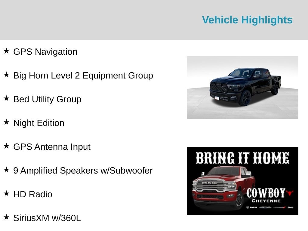 Diamond Black Crystal Pearlcoat 2025 Ram 1500 Big Horn/Lone Star 4WD 8-Speed Automatic 3.0L I6 115V Auxiliary Power Outlet, 115V Auxiliary Rear Power Outlet, 12" Touchscreen Display, 2nd Row In Floor Storage Bins, 3 Rear Seat Head Restraints, 4 Way Front Headrests, 400W Inverter, 4G LTE Wi-Fi Hot Spot, 9 Amplified Speakers w/Subwoofer, Accent Color Door Handles, Accent Color Premium Power Mirrors, Accent Color Tailgate Handle, Air Conditioning ATC w/Dual Zone Control, Anti-Spin Differential Rear Axle, Apple CarPlay, Auto Power-Folding Mirrors, Auto-Dimming Exterior Driver Mirror, Auto-Dimming Rear-View Mirror, Bed Utility Group, Big Horn Level 2 Equipment Group, Black Exterior Mirrors, Black Exterior Truck Badging, Black Headlamp Bezels, Black Interior Accents, Black Painted Exterior Mirrors Caps, Black Premium Power Mirrors, Black Tail Lamp Bezels, Body Color Front Bumper, Body Color Rear Bumper w/Step Pads, Bucket Seats, Cluster 7.0" TFT Color Display, Configurable Drive Mode, Connected Travel & Traffic Services, Connectivity - US/Canada, Convex Wide-Angle Exterior Mirror Insert, Deluxe Cloth Bucket Seats, Exterior 115V AC Outlet, Exterior Mirrors Courtesy Lamps, Exterior Mirrors w/Heating Element, Exterior Mirrors w/Supplemental Signals, Front Seat Back Map Pockets, Full Length Floor Console, Glove Box Lamp, Google Android Auto, GPS Antenna Input, GPS Navigation, Grille Black Surround Black Mesh, HD Radio, Heated Front Seats, Heated Steering Wheel, Integrated Voice Command w/Bluetooth, Leather Wrapped Steering Wheel, LED Dome Lamp w/On/Off Switch, LED Footwell Lighting, Manual Adjust 4-Way Front Passenger Seat, Media Hub w/2 Charge Only USBs, MOPAR 4 Adjustable Cargo Tie-Down Hooks, MOPAR Spray In Bedliner, Night Edition, Overhead LED Lamps, Pick-Up Box Lighting, Power 2-Way Driver Lumbar Adjust, Power Adjust 8-Way Driver Seat, Power Adjustable Pedals, Premium Overhead Console, Radio: Uconnect 5 Nav w/12.0" Display, RAM Grille Badge - Black, Rear 60/40 Folding Seat, Rear Center Armrest, Rear Power Sliding Window, Rear Window Defroster, Remote Tailgate Release, Security Alarm, SiriusXM w/360L, Steering Wheel Mounted Audio Controls, Sun Visors w/Illuminated Vanity Mirrors, Universal Garage Door Opener, USB Host Flip, Wheels: 20" x 9.0" Aluminum Painted Clad.