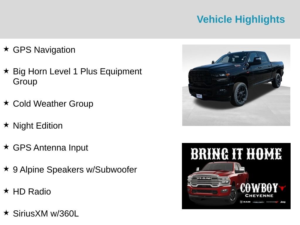 Diamond Black Crystal Pearlcoat 2025 Ram 2500 Big Horn 4WD 8-Speed Automatic 6.7L I6 12" Touchscreen Display, 2 Way Rear Headrest Seat, 2nd Row In Floor Storage Bins, 4 Way Front Headrests, 40/20/40 Split Bench Seat, 4G LTE Wi-Fi Hot Spot, 9 Alpine Speakers w/Subwoofer, Air Conditioning ATC w/Dual Zone Control, Alexa Built-In, Anti-Spin Differential Rear Axle, Apple CarPlay, Auto Power-Folding Mirrors, Auto-Dimming Rear-View Mirror, Big Horn Level 1 Plus Equipment Group, Black Exterior Mirrors, Black Exterior Truck Badging, Black Interior Accents, Black Wheel Center Hub, Body Color Grille Surround, Cold Weather Group, Connected Travel & Traffic Services, Connectivity - US/Canada, Dual Glove Boxes, Emergency Vehicle Alert System (EVAS), Engine Block Heater, Exterior Mirrors Courtesy Lamps, Exterior Mirrors w/Heating Element, Exterior Mirrors w/Supplemental Signals, Foam Bottle Insert (Door Trim Panel), Folding Flat Load Floor Storage, Footwell Courtesy Lamp, Forward & Reverse Utility Lights, Front Armrest w/Cupholders, Front Center Seat Cushion Storage, Front Seat Back Map Pockets, Global Telematics Box Module (TBM), Gloss Black Nostrils/Mic Black Grille, Glove Box Lamp, Google Android Auto, GPS Antenna Input, GPS Navigation, HD Radio, Integrated Voice Command w/Bluetooth, LED Bed Lighting, Locking Lower Glove Box, Luxury Steering Wheel, Manual Adjust 4-Way Front Passenger Seat, Mirror Running Lights, MOPAR Deployable Bed Step, MOPAR Spray In Bedliner, MOPAR Winter Front Grille Cover, Night Edition, Off-Road Info Pages, Painted Front Bumper, Painted Rear Bumper, Power 2-Way Driver Lumbar Adjust, Power Adjust 8-Way Driver Seat, Power Adjust Mirrors, Power Adjustable Convex Aux Mirrors, Power Heated Folding Telescopic Mirrors, Power Telescoping Mirrors, Premium Cloth 40/20/40 Bench Seat, Radio: Uconnect 5 Nav w/12.0" Display, Rear 60/40 Folding Seat, Rear Dome w/On/Off Switch Lamp, Remote Start System, Remote USB Port - Charge Only, Selectable Tire Fill Alert, SiriusXM Radio Service, SiriusXM w/360L, Steering Wheel Mounted Audio Controls, Storage Tray, Trailer Tow Pages, Wheels: 20" x 8.0" Black Painted Aluminum. Price includes: $2000 - 2025 National Bonus Cash . Exp. 11/03/2025
