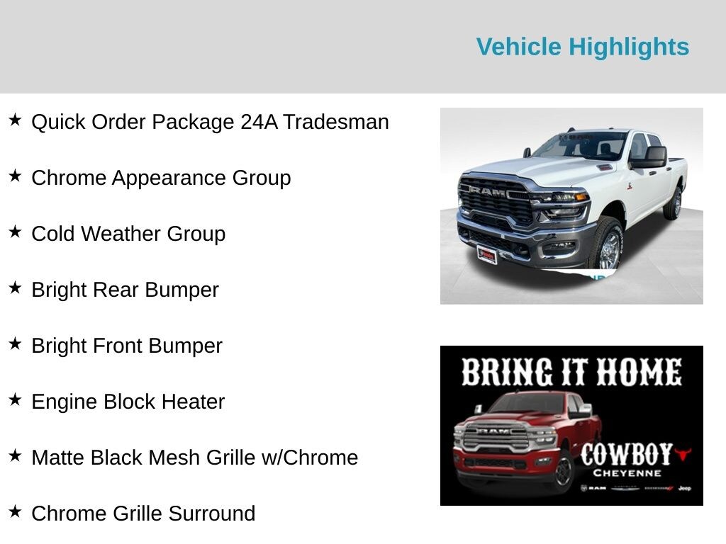 New Price! Bright White Clearcoat 2025 Ram 2500 Tradesman 4WD 8-Speed Automatic 6.7L I6 Bright Front Bumper, Bright Rear Bumper, Center Hub, Chrome Appearance Group, Chrome Grille Surround, Cold Weather Group, Engine Block Heater, Matte Black Mesh Grille w/Chrome, MOPAR Winter Front Grille Cover, Quick Order Package 24A Tradesman, Wheels: 18" x 8.0" Steel Chrome Clad. Price includes: $2000 - 2025 National Bonus Cash . Exp. 11/03/2025