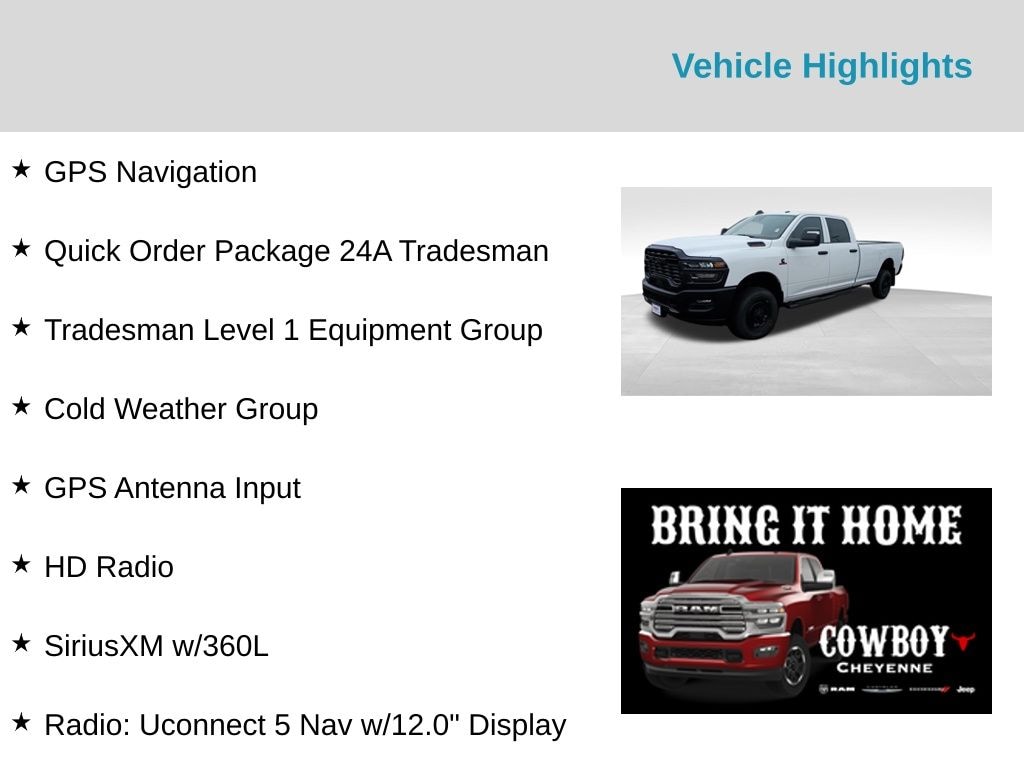 Bright White Clearcoat 2025 Ram 2500 Tradesman 4WD 8-Speed Automatic 6.7L I6 115V Auxiliary Front Power Outlet, 12" Touchscreen Display, 2 Way Rear Headrest Seat, 4 Way Front Headrests, 40/20/40 Split Bench Seat, 400W Inverter, 4G LTE Wi-Fi Hot Spot, Air Conditioning ATC w/Dual Zone Control, Alexa Built-In, Anti-Spin Differential Rear Axle, Apple CarPlay, Auto-Dimming Rear-View Mirror, Black Exterior Mirrors, Carpet Floor Covering, Cloth 40/20/40 Bench Seat, Cold Weather Group, Connected Travel & Traffic Services, Connectivity - US/Canada, Disassociated Touchscreen Display, Emergency Vehicle Alert System (EVAS), Engine Block Heater, Exterior 115V AC Outlet, Exterior Mirrors Courtesy Lamps, Exterior Mirrors w/Heating Element, Exterior Mirrors w/Supplemental Signals, Front & Rear Floor Mats, Front Armrest w/Cupholders, Global Telematics Box Module (TBM), Google Android Auto, GPS Antenna Input, GPS Navigation, HD Radio, Integrated Voice Command w/Bluetooth, Manual Adjust 4-Way Driver Seat, Manual Adjust 4-Way Front Passenger Seat, Manual Folding Exterior Mirrors, Manual Telescoping Mirrors, Mirror Running Lights, Mopar Black Tubular Side Steps, MOPAR Winter Front Grille Cover, Off-Road Info Pages, ParkSense Front/Rear Park Assist System, Power Adjust Mirrors, Power Adjustable Convex Aux Mirrors, Power Heated Folding Telescope Mirrors, Quick Order Package 24A Tradesman, Radio: Uconnect 5 Nav w/12.0" Display, Rear Folding Seat, Rear Power Sliding Window, Remote USB Port - Charge Only, Selectable Tire Fill Alert, SiriusXM Radio Service, SiriusXM w/360L, Storage Tray, Tinted Acoustic Windshield Glass, Tradesman Level 1 Equipment Group, Trailer Tow Pages. Price includes: $2000 - 2025 National Bonus Cash . Exp. 11/03/2025