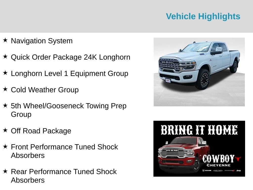 Bright White Clearcoat 2025 Ram 2500 Limited 4WD 8-Speed Automatic 6.7L I6 5th Wheel/Gooseneck Towing Prep Group, Active Lane Management System, Adaptive Steering System, Anti-Spin Differential Rear Axle, Cold Weather Group, CTR Stop Lamp w/Cargo View Camera, Digital Rearview Mirror, Drowsy Driver Detection, Engine Block Heater, Front Performance Tuned Shock Absorbers, LED Bed Lighting, Longhorn Instrument Cluster Theme 3, Longhorn Level 1 Equipment Group, MOPAR Spray In Bedliner, MOPAR Winter Front Grille Cover, Navigation System, Off Road Package, Pickup Box, Power Deployable Running Boards, Quick Order Package 24K Longhorn, Rear Performance Tuned Shock Absorbers, Surround View Camera System, Traffic Sign Recognition, Trailer Reverse Guidance, Trailer Tire Pressure Monitoring System, Vendor Painted Cargo Box, Vendor Painted Cargo Box Tracking, Wheels: 20" x 8.0" Diam Cut Alum w/Blk Pt Pock. Price includes: $2000 - 2025 National Bonus Cash . Exp. 11/03/2025