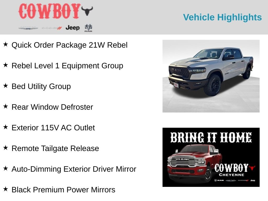 Bright White Clearcoat 2026 Ram 1500 Rebel 4WD 8-Speed Automatic 3.0L I6 Auto Power-Folding Mirrors, Auto-Dimming Exterior Driver Mirror, Bed Utility Group, Black Exterior Mirrors, Black Premium Power Mirrors, Convex Wide-Angle Exterior Mirror Insert, Exterior 115V AC Outlet, Exterior Mirrors Courtesy Lamps, Exterior Mirrors w/Heating Element, Exterior Mirrors w/Supplemental Signals, MOPAR 4 Adjustable Cargo Tie-Down Hooks, Power Adjustable Pedals, Quick Order Package 21W Rebel, Rear Window Defroster, Rebel Level 1 Equipment Group, Remote Tailgate Release, Wireless Charging Pad. Price includes: $2000 - 2026 National SFS Lease Loyalty Bonus Cash . Exp. 11/03/2025 $3500 - 2026 National Retail Consumer Cash . Exp. 11/03/2025