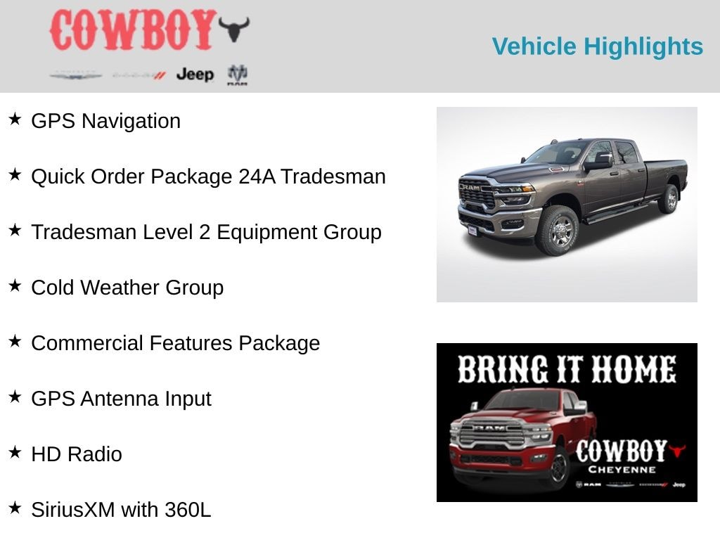 Granite Crystal Metallic Clearcoat 2026 Ram 2500 Tradesman 4WD 8-Speed Automatic 6.7L I6 115-Volt Auxiliary Front Power Outlet, 12" Touchscreen Display, 2 Way Rear Headrest Seat, 4 Way Front Headrests, 40/20/40 Split Bench Seat, 400W Inverter, 4G LTE Wi-Fi Hot Spot, Air Conditioning ATC with Dual Zone Control, Alexa Built-in, Anti-Spin Differential Rear Axle, Apple CarPlay, Auto-Dimming Rear-View Mirror, Black Exterior Mirrors, Bright Front Bumper, Bright Rear Bumper, Carpet Floor Covering, Center Hub, Chrome Grille Surround, Cloth 40/20/40 Bench Seat, Cold Weather Group, Commercial Features Package, Connected Travel and Traffic Services, Connectivity - US/Canada, Disassociated Touchscreen Display, Emergency Vehicle Alert System (EVAS), Engine Block Heater, Exterior 115V AC Outlet, Exterior Mirrors Courtesy Lamps, Exterior Mirrors with Heating Element, Exterior Mirrors with Supplemental Signals, For Details, Visit DriveUconnect.com, For More Info, Call 800-643-2112, Front and Rear Floor Mats, Front Armrest with Cupholders, Global Telematics Box Module, Google Android Auto, GPS Antenna Input, GPS Navigation, HD Radio, Integrated Voice Command with Bluetooth, Manual Adjust 4-Way Driver Seat, Manual Adjust 4-Way Front Passenger Seat, Manual Folding Exterior Mirrors, Manuarl Telescoping Mirrors, Matte Black Mesh Grille with Chrome, Mirror Running Lights, Mopar Black Tubular Side Steps, MOPAR Winter Front Grille Cover, Off-Road Info Pages, ParkSense Front/Rear Park Assist System, Power Adjust Mirrors, Power Heated Folding Telescope Mirrors, Power-Adjustable Convex Aux Mirrors, Quick Order Package 24A Tradesman, Radio: Uconnect 5 Navigation with 12.0" Display, Rear Folding Seat, Rear Power Sliding Window, Remote USB Port - Charge Only, Selectable Tire Fill Alert, SiriusXM Radio Service, SiriusXM with 360L, Storage Tray, Tinted Acoustic Windshield Glass, Tradesman Level 2 Equipment Group, Trailer Tow Pages, Wheels: 18" x 8.0" Steel Chrome Clad.