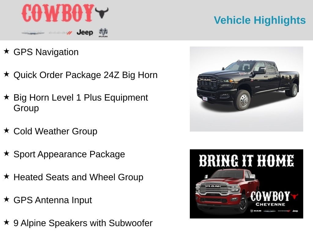 Diamond Black Crystal Pearlcoat 2026 Ram 3500 Big Horn 4WD 8-Speed Automatic 6.7L I6 12" Touchscreen Display, 2 Way Rear Headrest Seat, 2nd Row in Floor Storage Bins, 4 Way Front Headrests, 40/20/40 Split Bench Seat, 4G LTE Wi-Fi Hot Spot, 9 Alpine Speakers with Subwoofer, Air Conditioning ATC with Dual Zone Control, Alexa Built-in, Apple CarPlay, Auto Power-Folding Mirrors, Auto-Dimming Rear-View Mirror, Big Horn Level 1 Plus Equipment Group, Black Exterior Mirrors, Black Interior Accents, Body Color Grille Surround, Cloth 40/20/40 Premium Bench Seat, Cold Weather Group, Connected Travel and Traffic Services, Connectivity - US/Canada, Disassociated Touchscreen Display, Dual Glove Boxes, Emergency Vehicle Alert System (EVAS), Engine Block Heater, Exterior Mirrors Courtesy Lamps, Exterior Mirrors with Heating Element, Exterior Mirrors with Supplemental Signals, Foam Bottle Insert (door Trim Panel), Folding Flat Load Floor Storage, Footwell Courtesy Lamp, For Details Visit DriveUconnect.com, For More Info, Call 800-643-2112, Forward and Reverse Utility Lights, Front Armrest with Cupholders, Front Center Seat Cushion Storage, Front Seat Back Map Pockets, Global Telematics Box Module, Glove Box Lamp, Google Android Auto, GPS Antenna Input, GPS Navigation, HD Radio, Heated Front Seats, Heated Seats and Wheel Group, Heated Steering Wheel, Integrated Voice Command with Bluetooth, LED Bed Lighting, Locking Lower Glove Box, Luxury Steering Wheel, Manual Adjust 4-Way Front Passenger Seat, Mirror Running Lights, MOPAR Deployable Bed Step, MOPAR Spray in Bedliner, MOPAR Winter Front Grille Cover, Off-Road Information Pages, Painted Front Bumper, Painted Rear Bumper, Power 2-Way Driver Lumbar Adjust, Power Adjust 8-Way Driver Seat, Power Adjust Mirrors, Power Heated Fold Telescopic Mirrors, Power Telescoping Mirrors, Power-Adjustable Convex Aux Mirrors, Quick Order Package 24Z Big Horn, Radio: Uconnect 5 Navigation with 12.0" Display, Rear 60/40 Folding Seat, Rear Dome with on/Off Switch Lamp, Remote Start System, Remote USB Port - Charge Only, Selectable Tire Fill Alert, SiriusXM Radio Service, SiriusXM with 360L, Sport Appearance Package, Sport Decal, Steering Wheel Mounted Audio Controls, Storage Tray, Trailer Tow Pages.