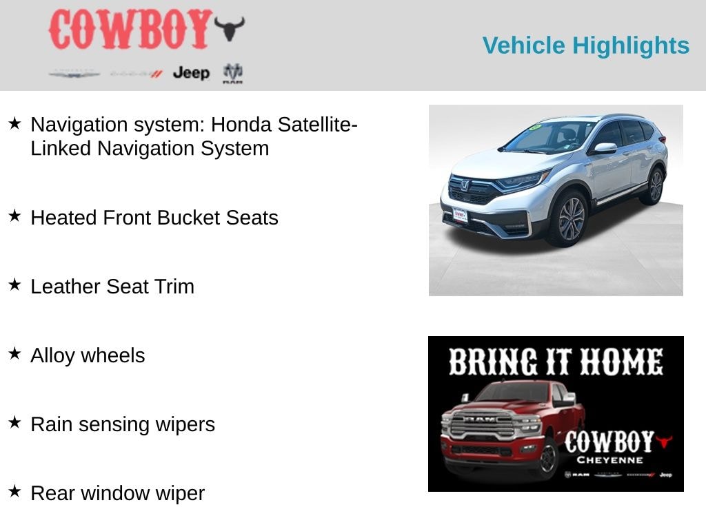 CARFAX One-Owner. CR-V Hybrid Touring, 4D Sport Utility, 2.0L I4 DOHC 16V, eCVT, AWD, White, Leather, Alloy wheels, Heated Front Bucket Seats, Leather Seat Trim, Navigation system: Honda Satellite-Linked Navigation System, Rain sensing wipers, Rear window wiper.