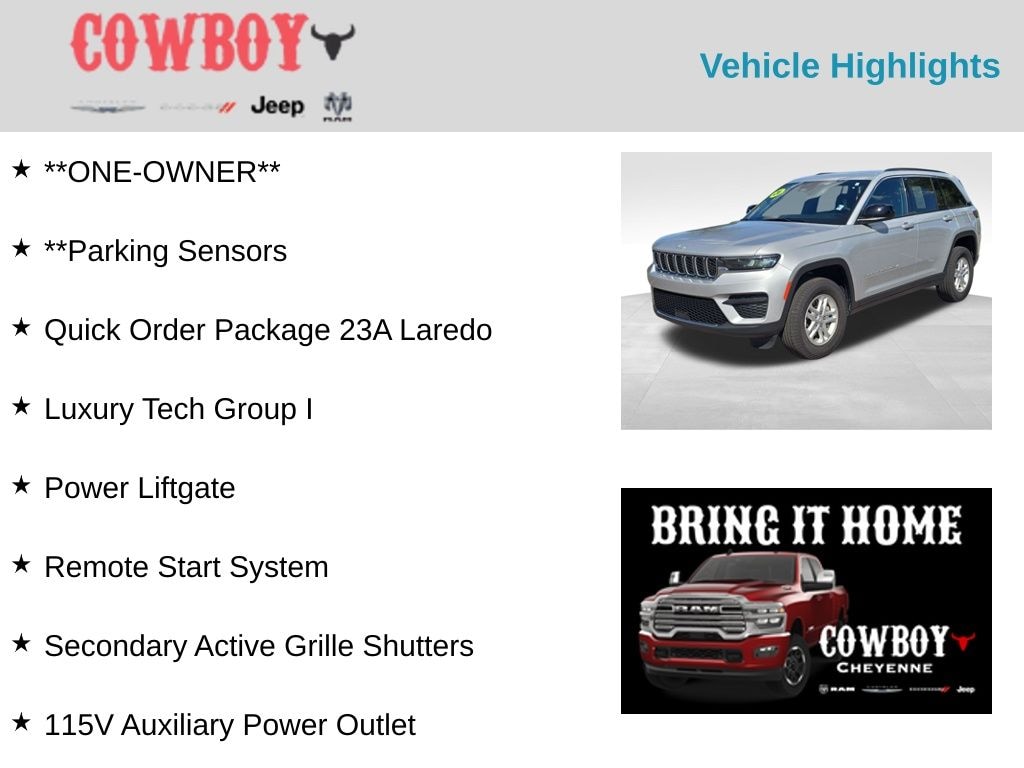 CARFAX One-Owner. Clean CARFAX. **ONE-OWNER**, **Parking Sensors, Grand Cherokee Laredo, 4D Sport Utility, 3.6L V6 24V VVT, 8-Speed Automatic, 4WD, Silver Zynith, Black Cloth, 115V Auxiliary Power Outlet, Heated Front Seats, Heated Steering Wheel, Luxury Tech Group I, Power Liftgate, Quick Order Package 23A Laredo, Rain Sensitive Windshield Wipers, Remote Start System, Secondary Active Grille Shutters, Selectable Tire Fill Alert, Wireless Charging Pad.