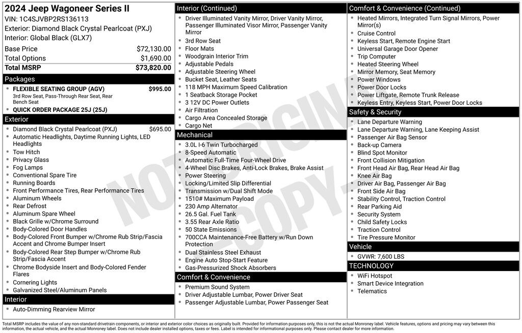 Recent Arrival! CARFAX One-Owner. **HEATED SEATS**, **LEATHER**, **Parking Sensors, **REAR BACKUP CAMERA**, **REMOTE START**, Wagoneer Series II, 4D Sport Utility, 3.0L I6, 8-Speed Automatic, 4WD, Diamond Black Crystal Pearlcoat, Black Leather, Quick Order Package 25J, Wheels: 20" x 9.0" Premium 2 Aluminum.