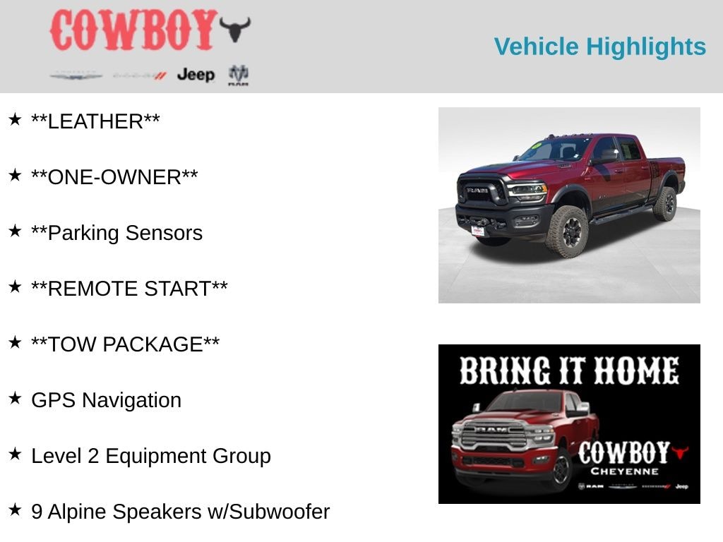 CARFAX One-Owner. Clean CARFAX. **LEATHER**, **ONE-OWNER**, **Parking Sensors, **REMOTE START**, **TOW PACKAGE**, 2500 Power Wagon, 4D Crew Cab, 6.4L V8, 8-Speed Automatic, 4WD, Delmonico Red Pearlcoat, Black Leather, 2-Door Passive Entry, Front Door Locks, 2nd Row In Floor Storage Bins, 9 Alpine Speakers w/Subwoofer, Air Conditioning ATC w/Dual Zone Control, Auto High Beam Headlamp Control, Black Exterior Mirrors, Body Color Door Handles, Exterior Mirrors Courtesy Lamps, Exterior Mirrors w/Heating Element, Exterior Mirrors w/Memory, Exterior Mirrors w/Supplemental Signals, Foam Bottle Insert (Door Trim Panel), Front Door Accent Lighting, GPS Navigation, Leather Trim 40/20/40 Bench Seat, LED Dome Lamp w/On/Off Switch, LED Interior Lighting, Level 2 Equipment Group, Mirror Running Lights, Mirror-Mounted Aux Reverse Lamps, Overhead LED Lamps, Power Adjustable Convex Aux Mirrors, Power Adjustable Pedals w/Memory, Power Black Tow Mirrors w/Convex Spotter & Memory, Power Folding Mirrors, Premium Overhead Console, Rain Sensitive Windshield Wipers, Rear Door Accent Lighting, Remote Start System, Remote Tailgate Release, Security Alarm, Sun Visors w/Illuminated Vanity Mirrors, Trailer Tow Mirrors, Universal Garage Door Opener.