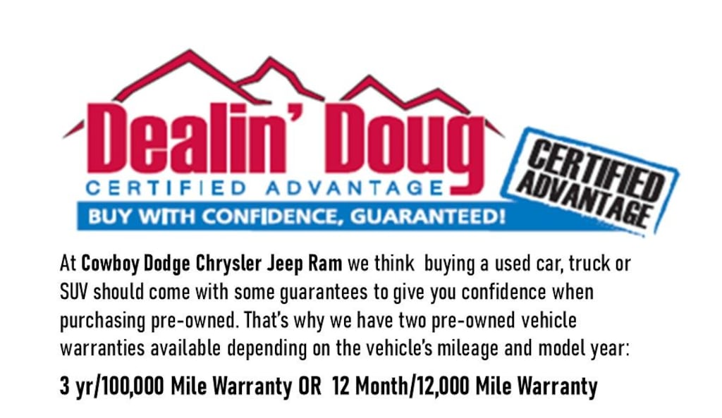 Certification Program Details: Our Dealin' Doug Certified Advantage provides a 3-year, 100k mile Powertrain Coverage or 12-month, 12k miles Powertrain Coverage, rental vehicle allowance, and 1-year sign and drive roadside assistance. Call us for more details at 307-317-4753.