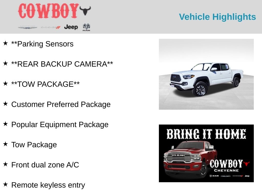 Clean CARFAX. **Parking Sensors, **REAR BACKUP CAMERA**, **TOW PACKAGE**, Customer Preferred Package, Popular Equipment Package, Tow Package, Tacoma TRD Sport V6, 4D Double Cab, 3.5L V6, 6-Speed, 4WD, White, ABS brakes, Alloy wheels, Electronic Stability Control, Exterior Parking Camera Rear, Front dual zone A/C, Heated door mirrors, Illuminated entry, Low tire pressure warning, Remote keyless entry, Traction control.