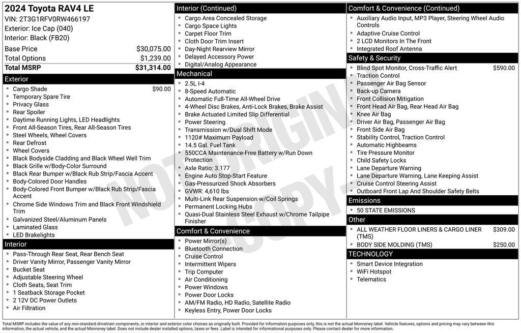 *MSRP is the Manufacturer's Suggested Retail Price (MSRP) of the vehicle. It does not include any taxes, fees or other gov't fees. Pricing and availability may vary based on a variety of factors, including options, dealer, specials, fees, and financing qualifications. Consult your dealer for actual price and complete details. Vehicles shown may have optional equipment at additional cost.