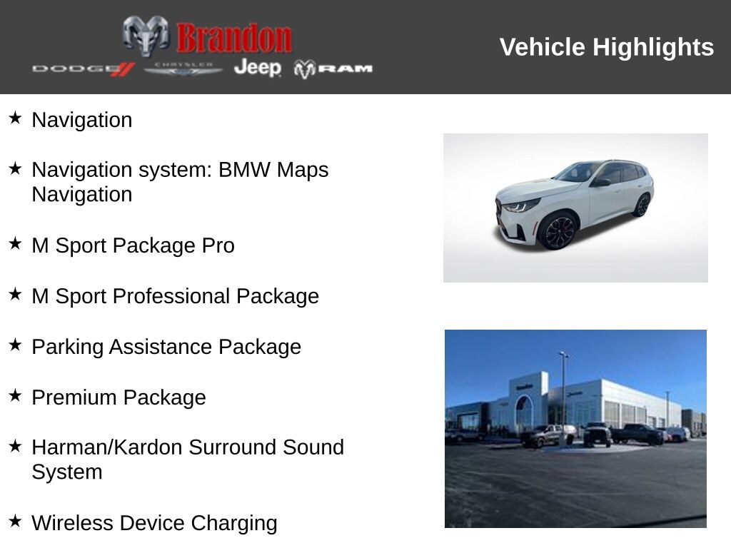 Certified. Alpine White 2025 BMW X3 M50 xDrive AWD 8-Speed Automatic I6 X3 M50 xDrive, 8-Speed Automatic, AWD, Alpine White, ACC Stop and Go + Active Driving Assistant, BMW Curved Display with HUD, Extended Shadowline Trim, Full LED Lights with Cornering Lights, Harman/Kardon Surround Sound System, Interior Camera, M Shadowline Lights, M Sport Brakes with Red Calipers, M Sport Package Pro, M Sport Professional Package, Navigation, Navigation system: BMW Maps Navigation, Parking Assistance Package, Parking Assistant Plus, Parking Assistant Professional, Premium Content 1, Premium Package, Steering wheel mounted audio controls, Wireless Device Charging.