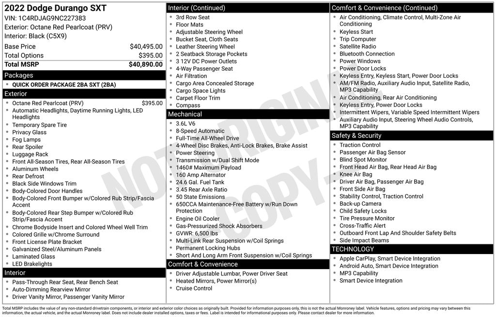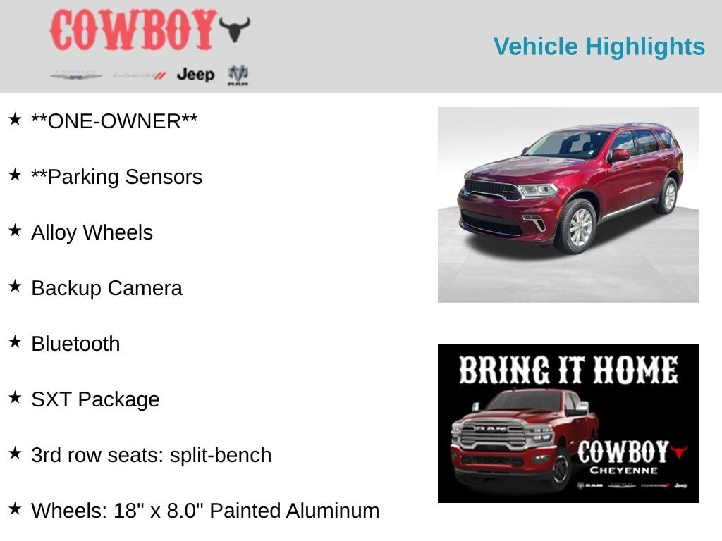 CARFAX One-Owner. Clean CARFAX. Certified. **ONE-OWNER**, **Parking Sensors, Alloy Wheels, Backup Camera, Bluetooth, SXT Package, Durango SXT, 4D Sport Utility, 3.6L V6 24V VVT, 8-Speed Automatic, AWD, Octane Red Pearlcoat, Black Cloth, 3rd row seats: split-bench, Wheels: 18" x 8.0" Painted Aluminum.