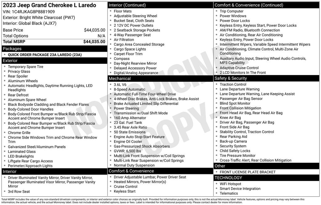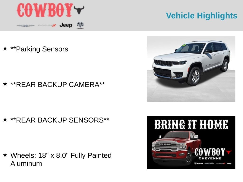 CARFAX One-Owner. Clean CARFAX. Certified. **Parking Sensors, **REAR BACKUP CAMERA**, **REAR BACKUP SENSORS**, Grand Cherokee L Laredo, 4D Sport Utility, 3.6L V6 24V VVT, 8-Speed Automatic, 4WD, Bright White Clearcoat, Black Cloth, Wheels: 18" x 8.0" Fully Painted Aluminum.
