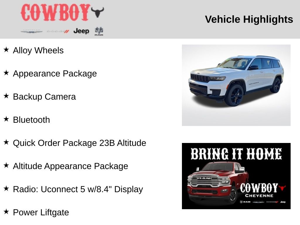 CARFAX One-Owner. Certified. Alloy Wheels, Appearance Package, Backup Camera, Bluetooth, Grand Cherokee L Altitude, 4D Sport Utility, 3.6L V6 24V VVT, 8-Speed Automatic, 4WD, Bright White Clearcoat, Global Black Artificial Leather, 115V Auxiliary Power Outlet, 3rd Row Charge-Only USB Ports, Altitude Appearance Package, Black Headliner, Capri Leatherette/Suede Seats, Delete Laredo Badge, Gloss Black Exterior Accents, Heated Front Seats, Heated Steering Wheel, Molded In Color Black/Gloss Black Roof Rails, ParkView Rear Back-Up Camera, Power Liftgate, Quick Order Package 23B Altitude, Radio: Uconnect 5 w/8.4" Display, Rain Sensitive Windshield Wipers, Remote Start System, Selectable Tire Fill Alert, Wheels: 18" x 8.0" Fully Painted Aluminum 1, Wheels: 20" x 8.5" Gloss Black Painted Aluminum, Wireless Charging Pad.