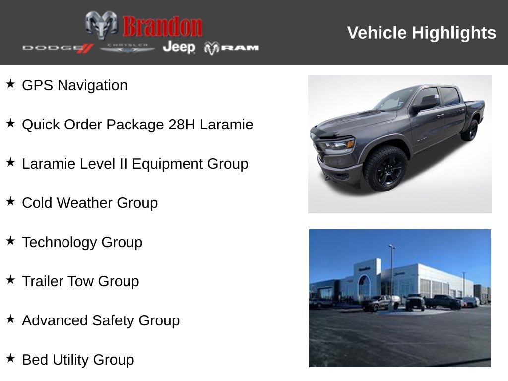 Certified. Granite Crystal Metallic Clearcoat 2022 Ram 1500 Laramie 4WD 8-Speed Automatic EcoDiesel 3.0L V6 4D Crew Cab, EcoDiesel 3.0L V6, 4WD, Granite Crystal Metallic Clearcoat, Black Leather, #1 Seat Foam Cushion, 2nd Row In Floor Storage Bins, 3 Rear Seat Head Restraints, 4 Way Front Headrests, 4G LTE Wi-Fi Hot Spot, 8.4" Touchscreen Display, Accent Color Premium Power Mirrors, Adaptive Cruise Control w/Stop & Go, Advanced Safety Group, All Plant-Installed Decals, All R1 High Radios, All Radio Equipped Vehicles, Apple CarPlay, Auto High Beam Headlamp Control, Auto-Dimming Exterior Driver Mirror, Bed Utility Group, Black Exterior Truck Badging, Black Headlamp Bezels, Black Interior Accents, Black Painted Exterior Mirrors Caps, Blind Spot & Cross Path Detection, Body Color Door Handles, Body Color Front Bumper, Body Color Rear Bumper w/Step Pads, Bucket Seats, Cold Weather Group, Connected Travel & Traffic Services, Connectivity - US/Canada, Convex Wide-Angle Mirror Insert, Delete LED Lamp - Floor Console Bin, Digital Rearview Mirror, Disassociated Touchscreen Display, Driver Seat Memory, Dual Exhaust w/Black Tips, E-Locker Rear Axle, Engine Block Heater, Exterior Mirrors Courtesy Lamps, Exterior Mirrors w/Heating Element, Exterior Mirrors w/Memory, Exterior Mirrors w/Supplemental Signals, Foam Bottle Insert (Door Trim Panel), For Details, Visit DriveUconnect.com, For More Info, Call 800-643-2112, Front Extra HD Shock Absorbers, Front Seat Back Map Pockets, Full Length Upgraded Floor Console, Global Telematics Box Module (TBM), Google Android Auto, GPS Antenna Input, GPS Navigation, Grille Surround 3 Black Texture 2 Black, harman/kardon 19 Speaker Premium Sound, HD Radio, Heads-Up Display, Heated Front Seats, Heated Steering Wheel, Hill Descent Control, Integrated Center Stack Radio, Integrated Voice Command w/Bluetooth, Lane Keep Assist, Laramie Level II Equipment Group, Leather Trimmed Bucket Seats, LED CHMSL Lamp, MOPAR 4 Adjustable Cargo Tie-Down Hooks, Mopar Black Tubular Side Steps, MOPAR Spray In Bedliner, MOPAR Winter Front Grille Cover, Night Edition, Off Road Decals, Off Road Group, Off-Road Information Pages, Parallel & Perp Park Assist w/Stop, ParkSense Front/Rear Park Assist w/Stop, Pedestrian Emergency Braking, Pick-Up Box Lighting, Power 2-Way Driver Lumbar Adjust, Power 2-Way Passenger Lumbar Adjust, Power 8-Way Driver & Passenger Seats, Power-Folding Mirrors, Quick Order Package 28H Laramie, Radio: Uconnect 5 Nav w/8.4" Display, Rain Sensitive Windshield Wipers, Raised Ride Height, Rear 60/40 Folding Seat, Rear Extra HD Shock Absorbers, Remote Tailgate Release, SiriusXM Radio Service, SiriusXM w/360L, Sport Performance Hood, Surround View Camera System, Tailgate Ajar Warning Lamp, Technology Group, Tow Hooks, Trailer Brake Control, Trailer Light Check, Trailer Reverse Steering Control, Trailer Tire Pressure Monitoring System, Trailer Tow Group, Twill Film Appliques, USB Host Flip, Ventilated Front Seats, Wireless Charging Pad.
