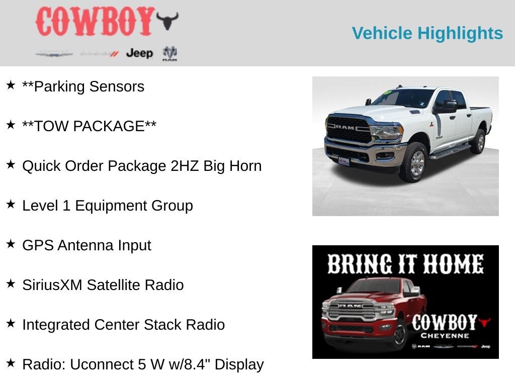 CARFAX One-Owner. Certified. **Parking Sensors, **TOW PACKAGE**, 2500 Big Horn, 4D Crew Cab, Cummins 6.7L I6 Turbodiesel, 6-Speed Automatic, 4WD, Bright White Clearcoat, Diesel Gray/Black Cloth, 2nd Row In Floor Storage Bins, 4G LTE Wi-Fi Hot Spot, 8.4" Touchscreen Display, Apple CarPlay, Auto Power-Folding Mirrors, Big Horn IP Badge, Black Exterior Mirrors, Bluetooth Handsfree Phone & Audio, Connectivity - US/Canada, Dual Glove Boxes, Exterior Mirrors Courtesy Lamps, Exterior Mirrors w/Heating Element, Exterior Mirrors w/Supplemental Signals, Foam Bottle Insert (Door Trim Panel), Footwell Courtesy Lamp, For Details, Visit DriveUconnect.com, For More Info, Call 800-643-2112, Forward & Reverse Utility Lights, Front Fog Lamps, Global Telematics Box Module (TBM), Glove Box Lamp, Google Android Auto, GPS Antenna Input, Integrated Center Stack Radio, Integrated Voice Command w/Bluetooth, Leather Wrapped Steering Wheel, Level 1 Equipment Group, Locking Lower Glove Box, Mirror Running Lights, Power Adjust Mirrors, Power Adjustable Convex Aux Mirrors, Power Heated Fold Telescope Mirrors, Power Telescoping Mirrors, Premium Cloth 40/20/40 Bench Seat, Quick Order Package 2HZ Big Horn, Radio: Uconnect 5 W w/8.4" Display, Rear Dome w/On/Off Switch Lamp, Selectable Tire Fill Alert, SiriusXM Radio Service, SiriusXM Satellite Radio, Steering Wheel Mounted Audio Controls.